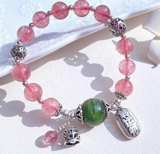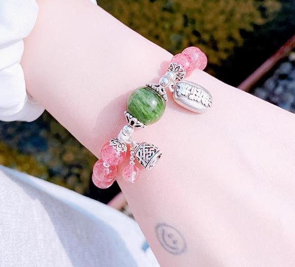 揉合綠透輝石的清新生機、冰種草莓晶的甜潤人緣,與粉水晶的溫柔愛意。三色共生,層次剔透如初融冰晶。